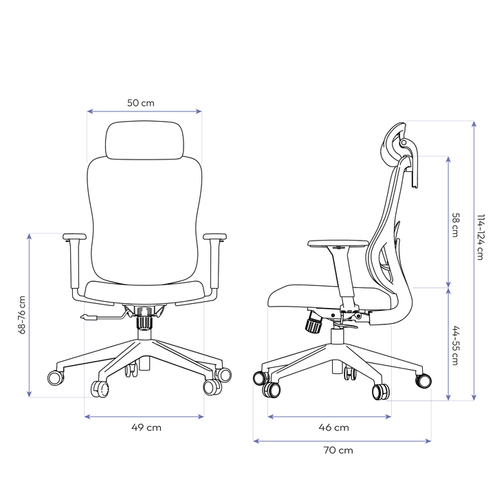 A Sarin também oferece ajustes completos (altura do assento, apoio lombar, encosto reclinável, apoio de cabeça e braços reguláveis), entregando ergonomia personalizada para diferentes biotipos e estilos de uso.