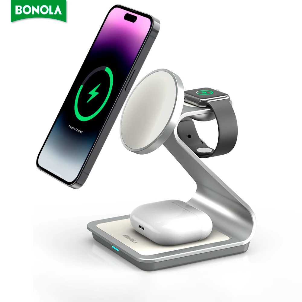 Descubra a praticidade do Carregador Magnético 3 em 1 da Bonola, projetado para tornar sua vida mais fácil e seus dispositivos sempre carregados.