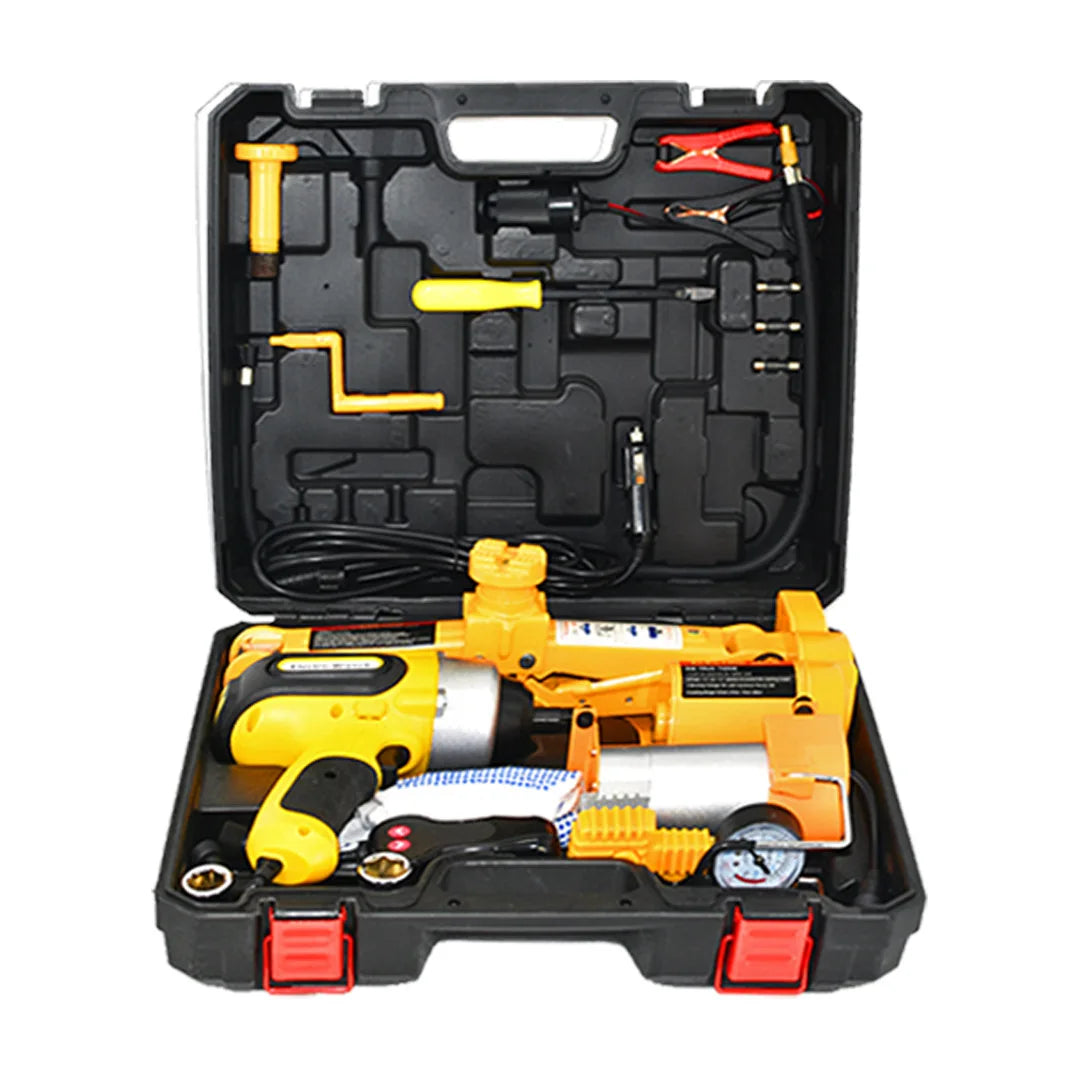 - Acessórios Incluídos: Macaco elétrico, chave de impacto, compressor de ar, dois soquetes, par de luvas, cabo de extensão com braçadeira de bateria, carregador de carro e estojo de armazenamento.